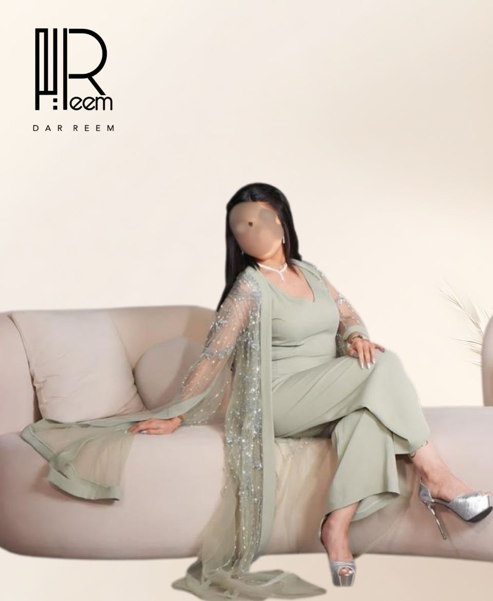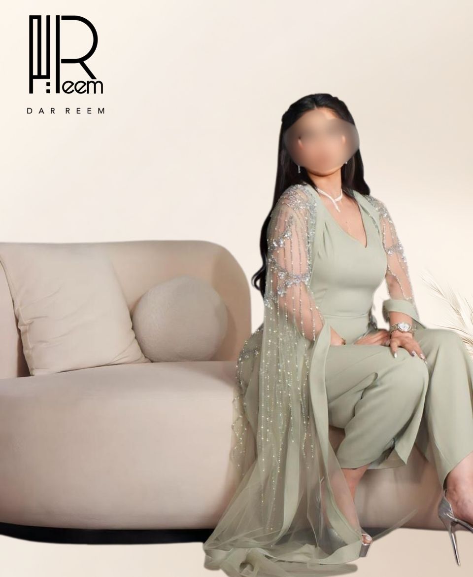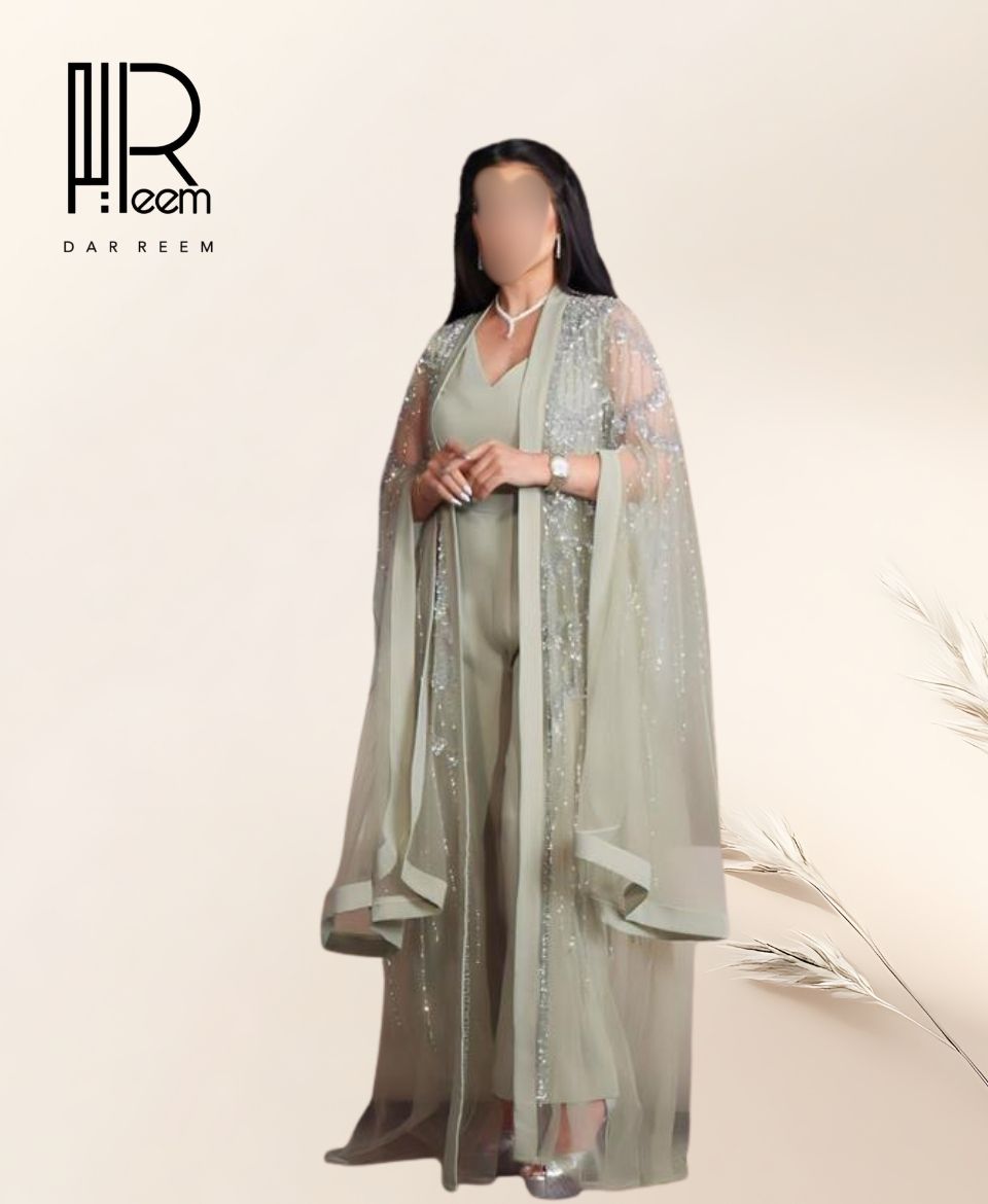 تناغم القماش الزيتي الفاتح مع الكاب الشفاف المتلألئ يضفي لمسة أنثوية ساحرة وأناقة عصرية متوازنة، ليكون هذا الطقم خيارًا مثاليًا للسهرات الراقية، حفلات الخطوبة، والمناسبات الرسمية الفاخرة.