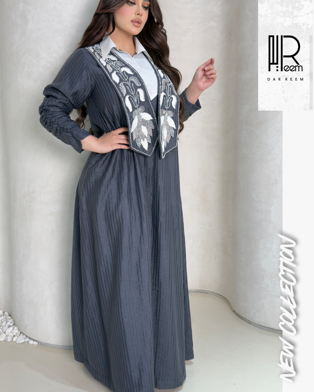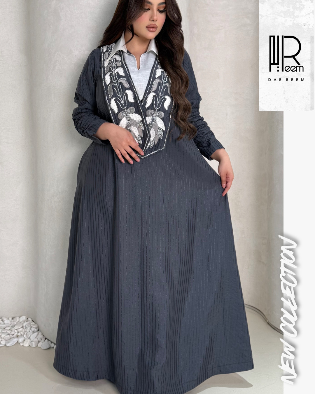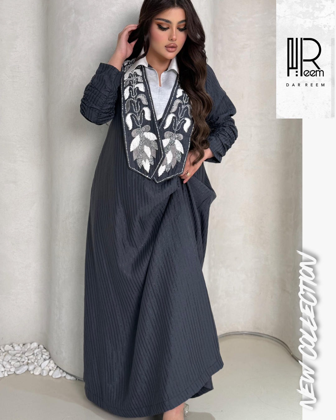 يتميز التصميم بلون رمادي داكن أنيق يعكس فخامة هادئة تناسب مختلف الأوقات، مع تطريز يدوي فني مستوحى من الزخارف الطبيعية يزين الجزء الأمامي بأسلوب راقٍ يمنح القطعة حضوراً مميزاً. كما تضيف القصة الواسعة مع القماش المخطط بانسيابية لمسة عصرية أنيقة تمنح راحة وأناقة في الحركة.