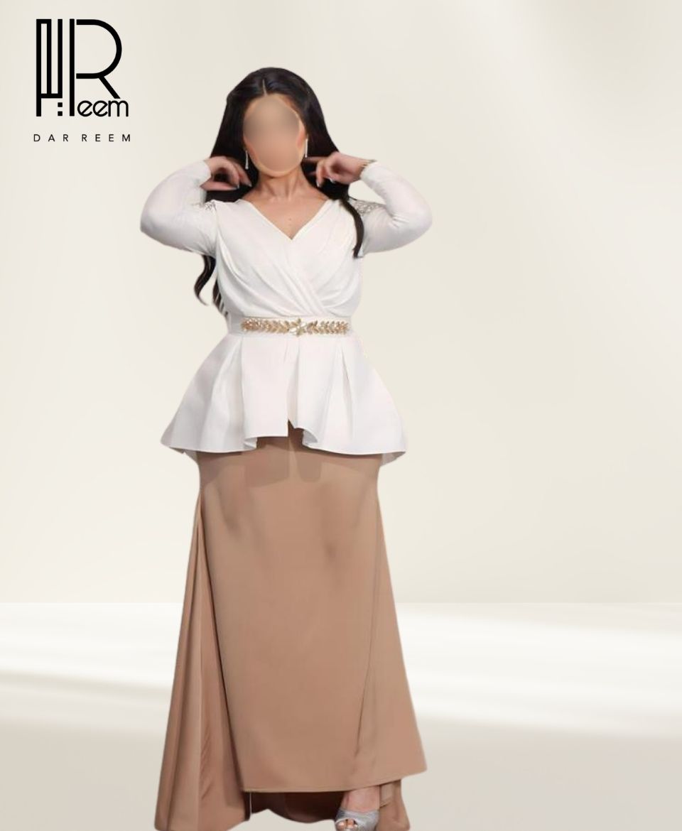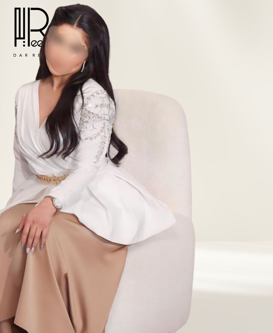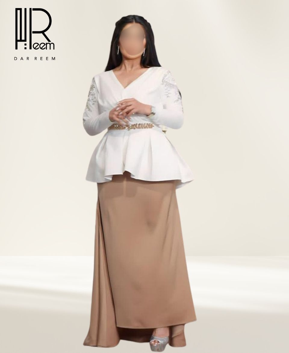 يتميّز هذا التصميم بتناسق أنيق بين اللون الأبيض النقي والبيج الدافئ مع قصّة راقية وحزام ذهبي فاخر يبرز جمال الخصر بأسلوب أنثوي جذاب، ليمنحك إطلالة ناعمة وفخمة في آنٍ واحد.