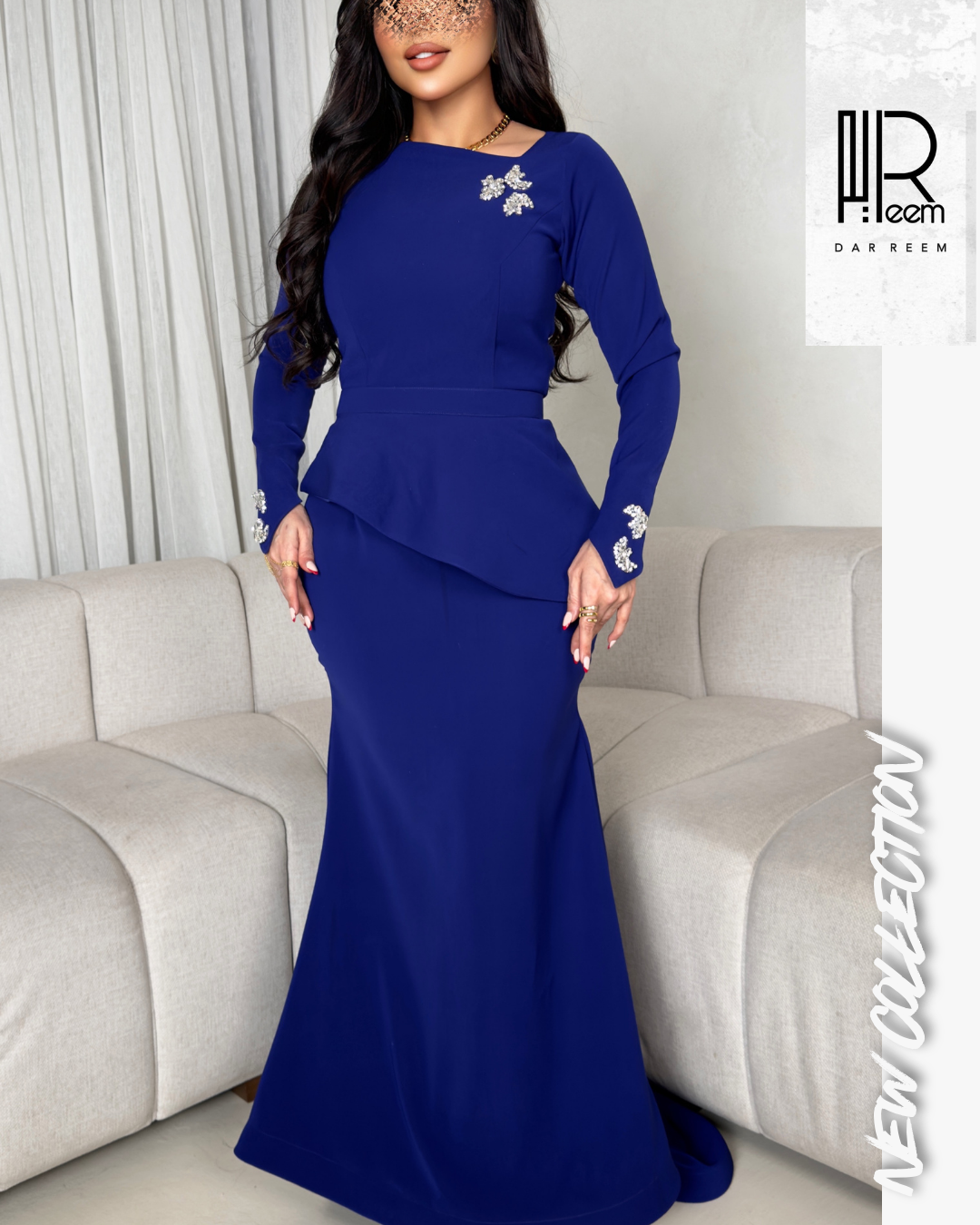 يتميز الفستان بلون أزرق ملكي عميق يعبر عن الثقة والرقي، مع قصة أنثوية منحوتة تبرز القوام بأناقة راقية. تضيف التفاصيل المرصعة بالكريستال على الكتف والأكمام لمسة فخمة ناعمة تمنح التصميم بريقاً راقياً دون مبالغة، ليحافظ على أناقته الهادئة بأسلوب راقٍ.